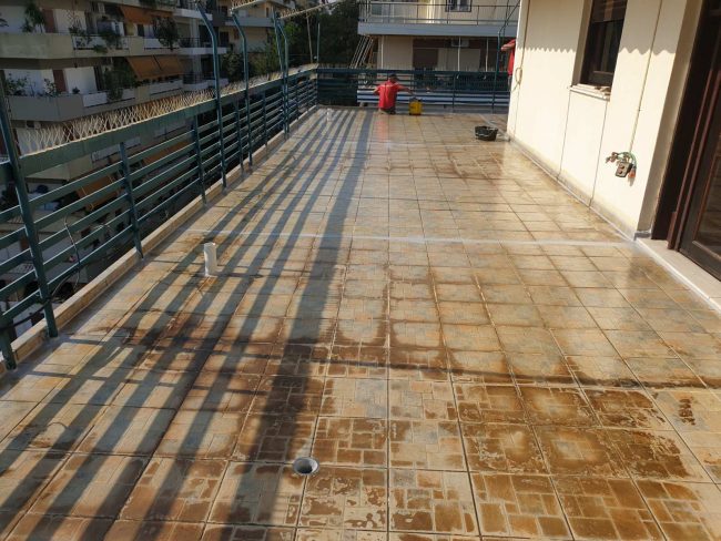 Υφιστάμενη Οικοδομή Τοποθεσία: ΖΩΓΡΑΦΟΥ Επιφάνεια: 119m2 Κατηγορία: Στεγανοποίηση – Υγρομόνωση Κατασκευή στεγανοποίησης – υγρομόνωσης βεράντας με χυτή πολυουρεθανική μεμβράνη και τελική στρώση από γκρι αλιφατική μεμβράνη.