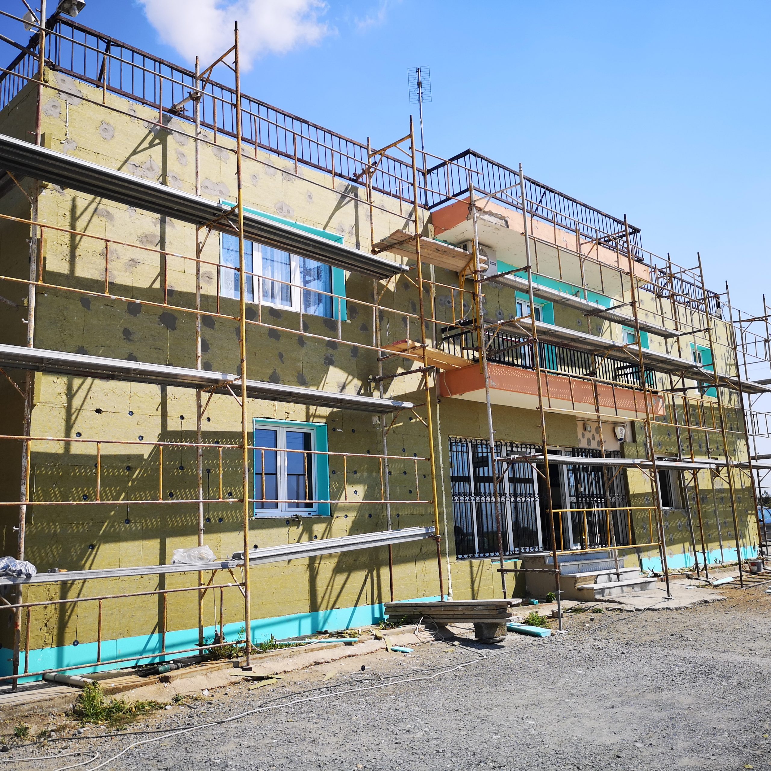 Εξωτερική θερμομόνωση κτιρίου με πυραντοχο σύστημα από πλάκες πετροβάμβακα κ σιλικονούχο επίχρισμα.